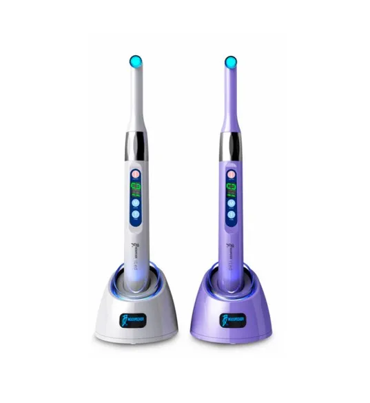 Lámpara LED de fotocurado de alto poder (hasta 2500 mW/cm²). Fotopolimeriza 2 mm de resina en 1 segundo. Ligera, recargable y con amplio rango de longitud de onda (420–480 nm).